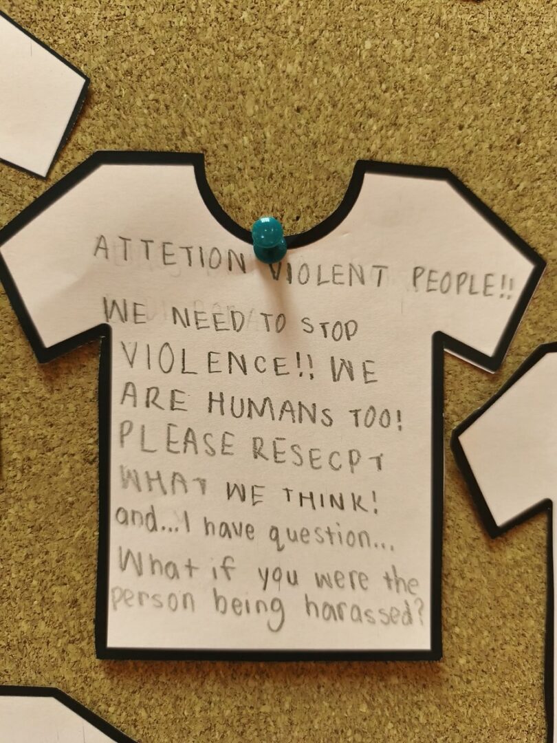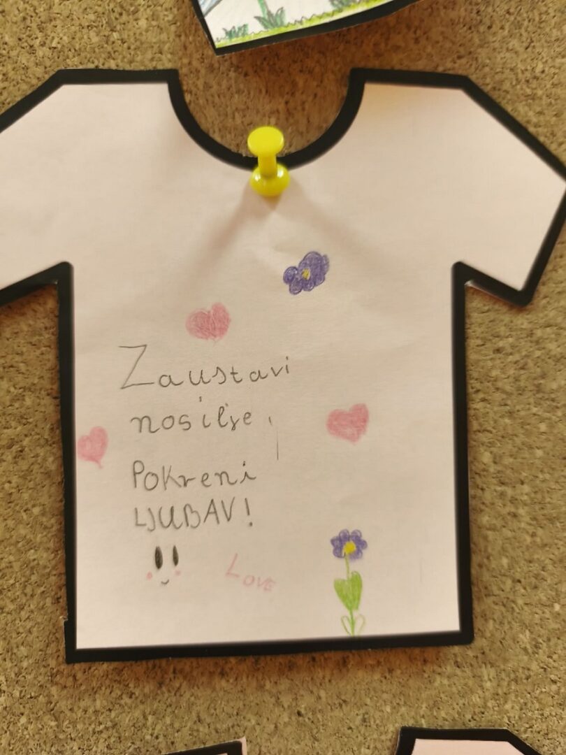 U sklopu projekta obilježili smo i Dan ružičastih majica (25. 2.). Osim što pišemo domaće zadaće, ponavljamo nastavni sadržaj i igramo se, veliki naglasak stavljamo i na disciplinu te primjerena i neprimjerena ponašanja. Učenici su pogledali prigodne video uratke o borbi protiv nasilja. Nakon toga su se preko rasprave prisjetili što je nasilje, koje vrste nasilja postoje (verbalno i fizičko) i kako ga možemo spriječiti. Obukli su ružičaste majice, napisali upečatljive poruke protiv nasilja te pozive na toleranciju i empatiju.