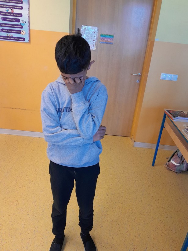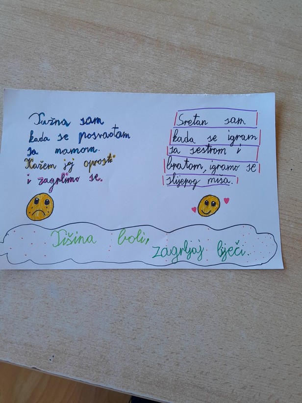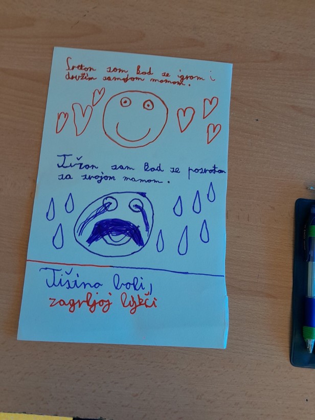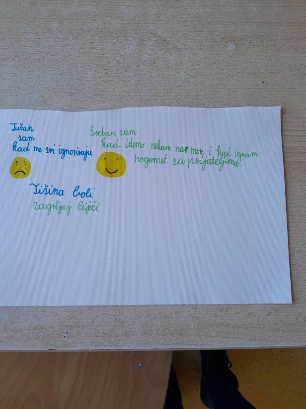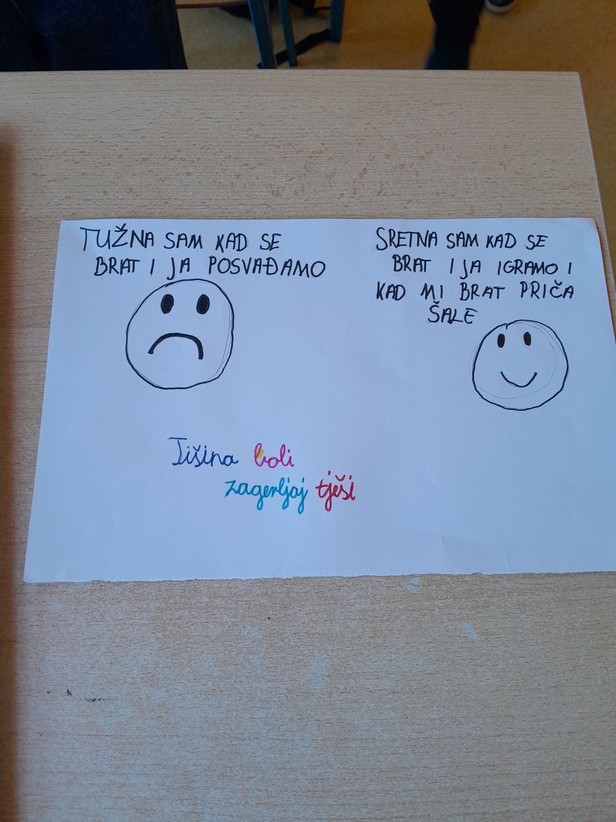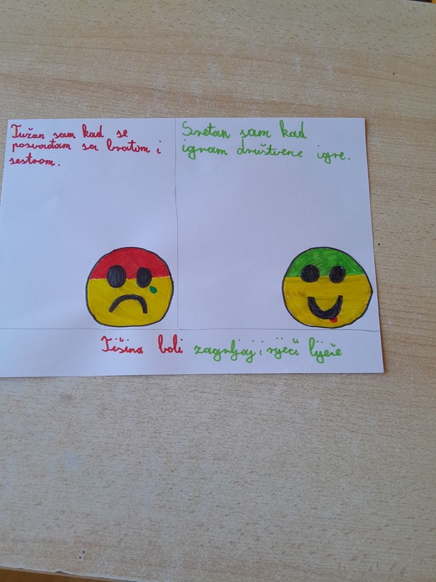 Razgovarali smo o osjećajima, kada smo i zbog čega tužni, ljuti, povrijeđeni, na koji način umanjujemo i otklanjamo bol uzrokovanu negativnim emocijama i što i nas usrećuje. Učenici su iznosili svoja iskustva na tu temu i na kraju nacrtali i pokazali kako izgleda tuga i bol, a kako sreća .