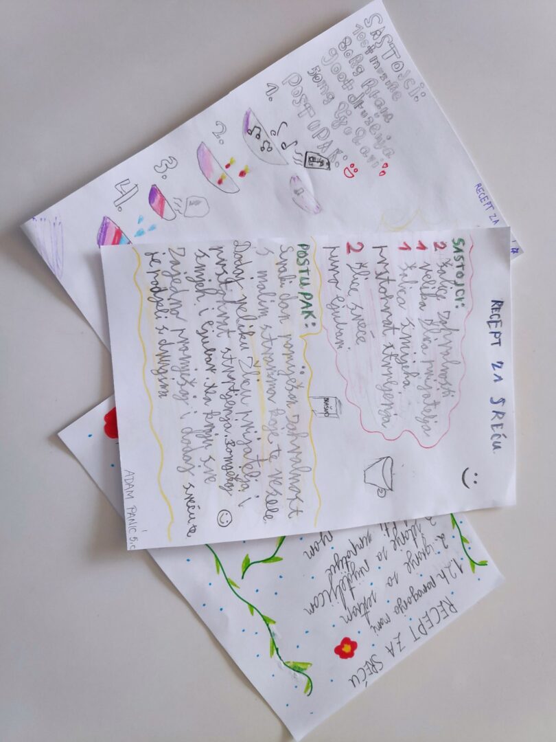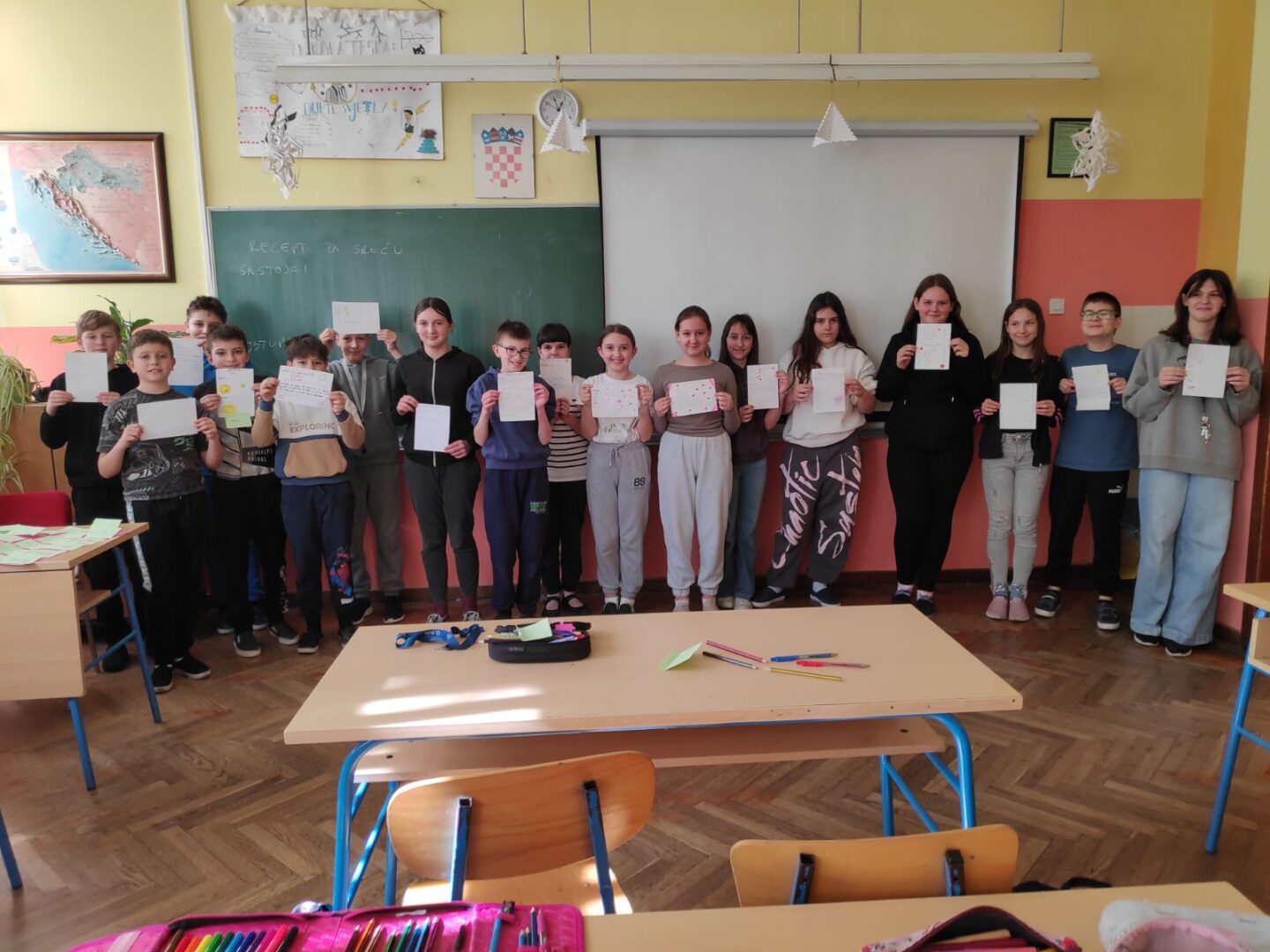 U ponedjeljak 16. 3. na satu razrednog odjela održali smo radionicu pod nazivom „Recept za sreću“. Pitala sam učenice i učenike znaju li neki recept, što znaju kuhati. Rekla sam im da će danas učiti kuhati, ali nešto posve posebno – a to je sreća. Dobili su zadatak da svatko napravi svoj recept koji je točan baš za njega ili nju. Neka nabroje sastojke, velike i male, u raznim količinama, pa neka svoj recept pogledaju i pospreme.