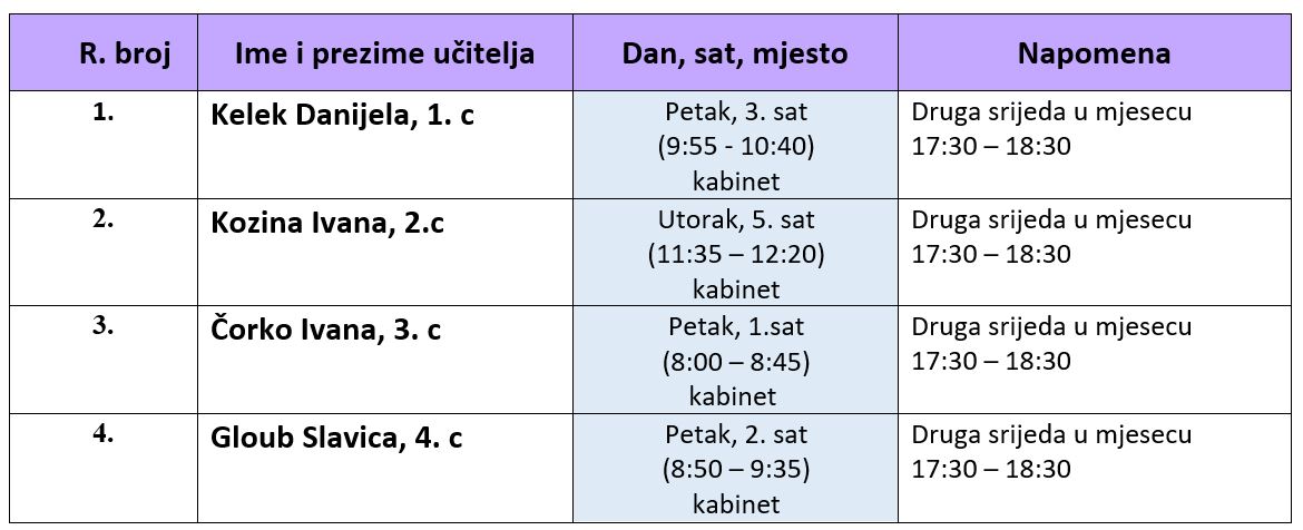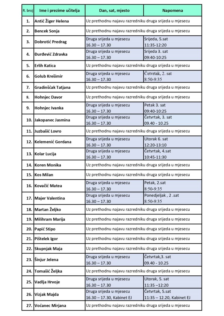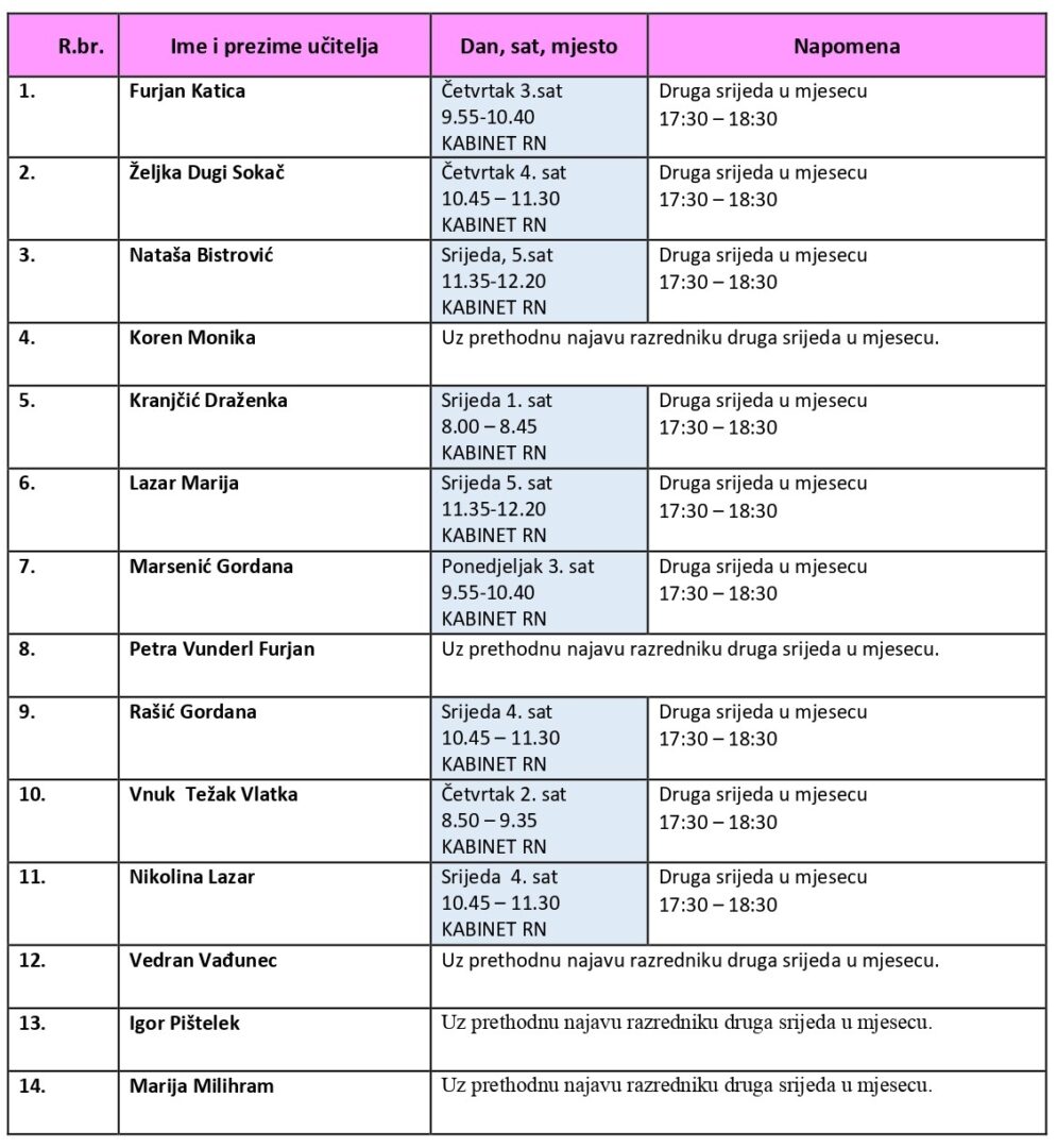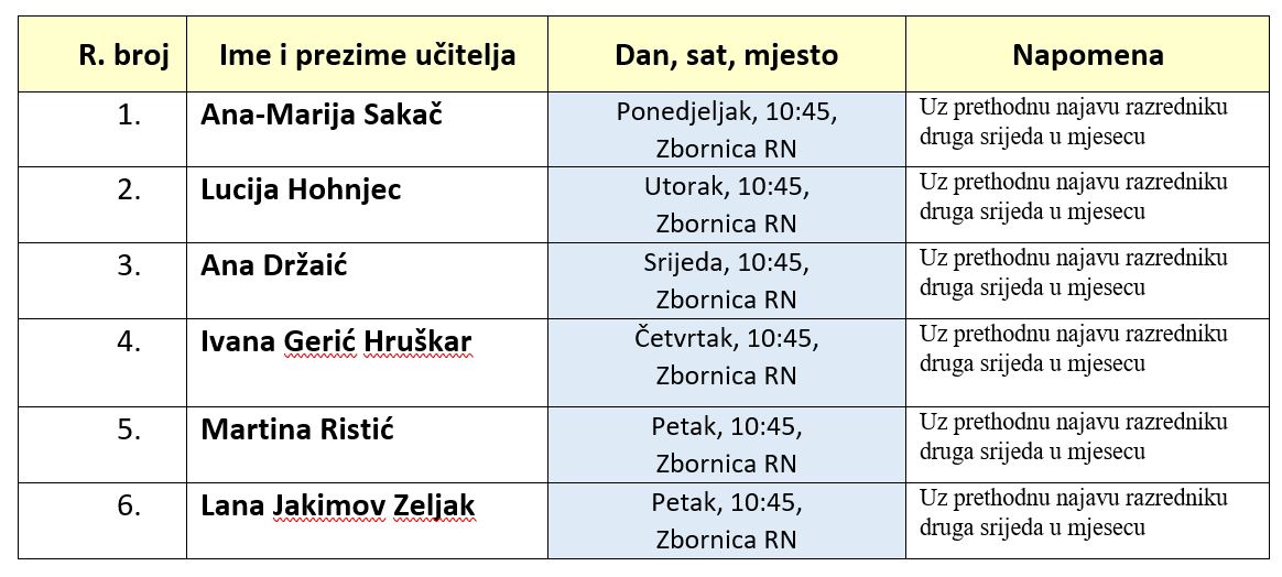 Primanja za roditelje održavaju se svake druge srijede u mjesecu od 17:30-18:30 sati ili prema rasporedu prikazanom u tabelama: