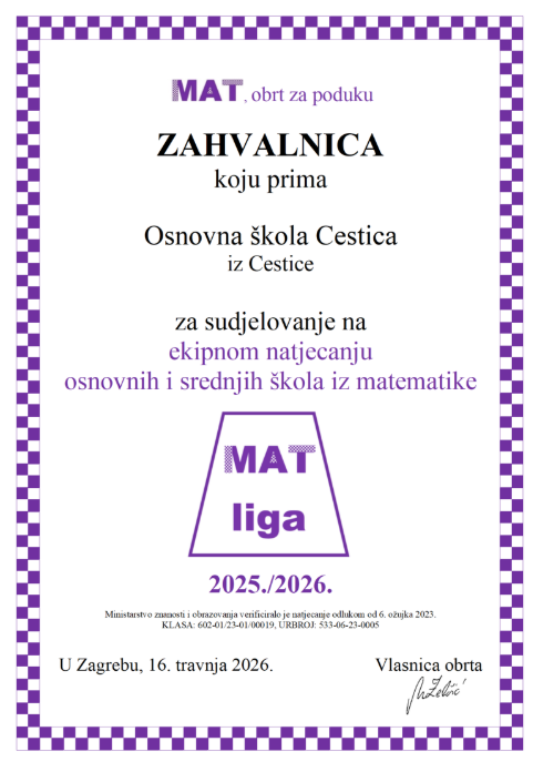 Ovo je 3. godina za redom kako se ekipe iz OŠ Cestica prijavljuju na MAT ligu.