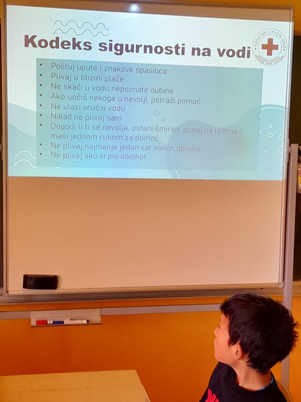 U 4.a, 4.b i 4.c razredu održano je predavanje “Kodeks sigurnosti na vodi” u suradnji s Crvenim križem. Predavanje je održao stručni suradnik za edukaciju Matej Mandek, djelatnik Crvenog križa. Učenici su upoznati s opasnostima koje se javljaju na vodi (grčevi, pothlađivanje, plovila i sl.) te im je detaljno predstavljen Kodeks sigurnosti na vodi – pravila ponašanja u blizini vode.